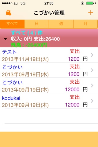 1.手軽こづかいにはすべて、日、週、月の4つの表示ができ