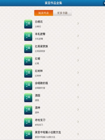 莫言作品全集包含白棉花,丰乳肥臀,红高粱家族,红蝗,红树林,会唱歌的强,酒国,酒神,老枪宝刀,莫言中短篇小说散文选,牛,生死疲劳,师傅越来越幽默,食草家族,四十一炮,檀香刑,天堂蒜薹之歌,透明的红萝卜,蛙,我们的荆轲,战友重逢,中州纪事等作品全集