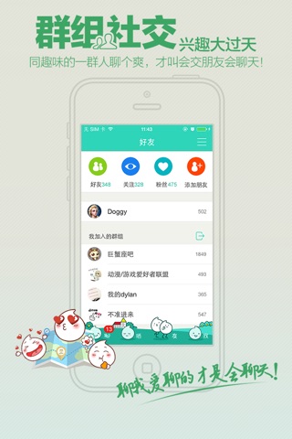 “聊聊”或已开创“召唤式”社交应用先河(or“聊聊”是“召唤式”社交应用先驱)。 一键让好友们同时上线,即时沟通互动。 “聊聊”的LBS兴趣群组社交功能,让你根据地理位置找到志趣相投的群组和朋友,火速开聊。在“聊聊”,迎接你的是焕然一新,新的圈子,新的朋友,还有新的你(or “聊聊”与众不同,新的圈子,新的朋友,还有新的你)。 我们不靠谱的预测--“聊聊”的震动“召唤”功能将带动潮流;我们不靠谱的预测--“聊聊”的“关灯”匿名聊天将被众人追捧;我们不靠谱的预测--“聊聊”标新立异的特色表情将让你欲罢不能;我们不靠谱的预测--... , 您打开看吧!