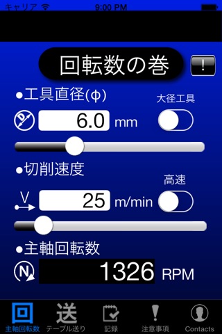 計算プログラムです。主にエンドミル、フェイスミルを使用する際に便利なツールになります。スライダーによるリアルタイム計算を実装しています。