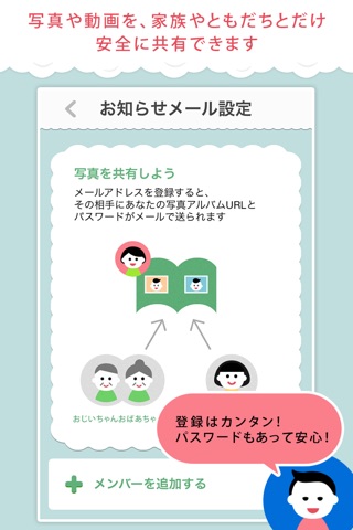 共有したい相手のメールアドレスを登録することで、アップロードした写真・動画・コメントを簡単に共有することができます。