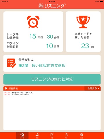毎日の勉強時間や本番モードの成績が記録されます。また、大問ごとに正答率が出るので、弱点克服の指針になります。