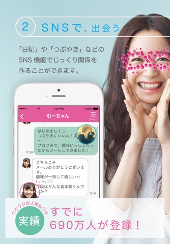 会員数690万人を誇るマッチングサービスです。友達作り、恋人探し、結婚…など多くのお客さまのご要望にお応えし、人々のつながりをサポートします。