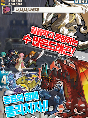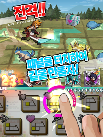 패널을 터치하여 길을 만들면 영웅들이 드래곤에게 진격합니다.