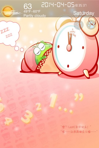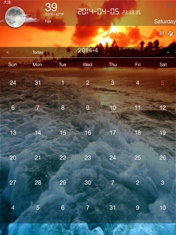 In the main view weather paddling up when the main weather view up to hide, will show titled 31 round buttons, click on the animation will show a lunar calendar or calendar, Chinese users will show lunar calendar, other countries show only normal calendar, no lunar information. After the calendar is displayed, click the button above or down calendar view again, the calendar will be hidden away.