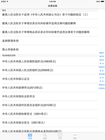 适合法律专业者随身查找使用,比如律师,法律学者,法律专业学生,公务员考试等. 法律大类一览: 国际法、行政及行政诉讼、经济法、民法、民事诉讼及仲裁、商法、司法制度及法职、宪法、刑法、刑事诉讼等.