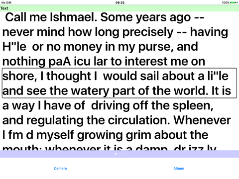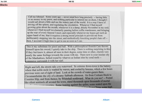 Use with the VoiceOver function turned on. There are two buttons at the bottom. The "Camera" button to capture an image from a camera. The "Album" button to pick a saved image from an album. A captured text is automatically saved to the Clipboard.
