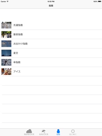 全国の洗濯指数、服装指数、お出かけ指数、星空、傘指数、アイス指数 を表示できます。