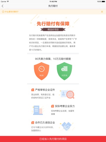 78.cn创业商机网对所有项目进行的严格资质审核,除了品类丰富,诚信可靠成为78商机所涵商机的一大优势。另外,78商机中部分项目参与先行赔付,用户认准“v”标识,可以享受最高10万元的78.cn先行赔付。