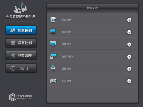 六合未来会议室智能控制系统是基于新一代物联网技术的智能会议室解决方案,利用物联网技术和智能感知设备组成智能网络,对各种操控复杂的会议室设备及相关的周边环境设备实现智能控制和人性化管理,从而构建一个全新的智能会议室应用环境,满足会议室不同类型的会议场景和使用功能的需要。
