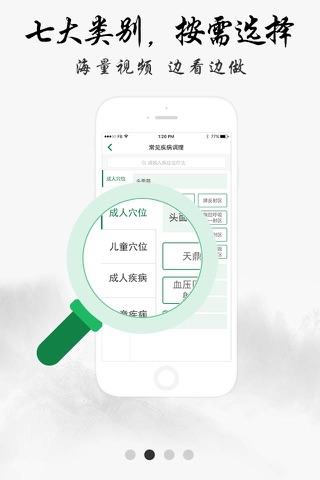 【海量视频】:视频涵盖人体400多个穴位的定位、疗效、手法、主治疾病,包括成人、儿童、老人,所有人群。