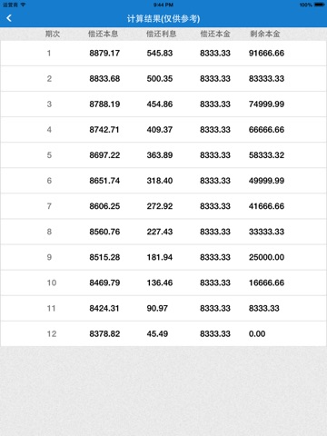 贷款还款:提供等额本金、等额本息2中方式计算贷款信息,信息有偿还本息、利息、本金、剩余本金;