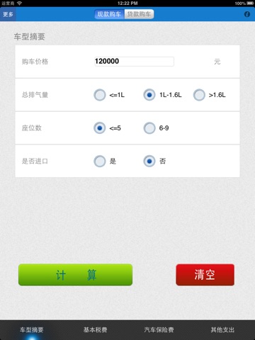 现款购车:提供车型摘要、基本税费、汽车保险费和其他指出计算,车型摘要(录入车辆基本信息)、基本税费(为你计算车辆购置税、车船使用税、机动车牌照费、验车费)、汽车保险费(强制保险、商业车险主险、商业车险附加险)、其他支出(灭火器、三角牌等);