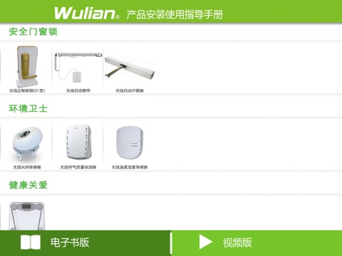 物联传感提供的智能家居可以控制多种Zigbee无线设备,具体分类如下: 安全保护:门锁、抽屉锁、门窗磁、红外探测器、可燃气探测器、烟雾火警探测器、太阳能电子栅栏、漏水探测器等、可燃气阀门、水流控制阀; 照明管理:调光器、各类开关等; 家电控制:插座、红外转发器(空调、电视、地暖、热水器)、窗帘控制器、百叶窗控制器、投影仪升降机、卷帘门控制器、车库门控制器、自动升降桌; 环境调节:空气质量探测器、环境光传感器、温湿度传感器、温度控制器等; 健康监测:体重计、血压计、跑步机等; 应急服务:紧急求助按钮、断电报警器、断电自照明系统、自供电电源;