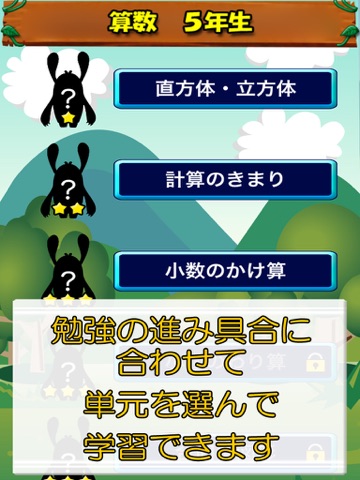 小学校5年生の算数アプリの決定版!学習の進み具合に合わせて単元を選択して、効率的に復習できます。4択のクイズ形式という使いやすさ、勉強のご褒美にモンスターを集めていく楽しさで、子供が継続的に勉強します。(iPad、iPhoneの両方に対応)