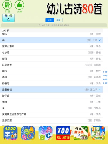 从易到难,循序渐进,分为4个学习阶段,每阶段20首诗,小朋友学起来轻松有趣,可一气呵成背完80手古诗。
