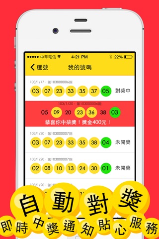 支援當期、多期及無限期對獎功能。將選好的號碼存進「樂透囉!」APP,開獎即時通知中獎與否好貼心。(需打開推播通知權限)