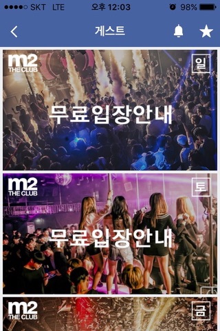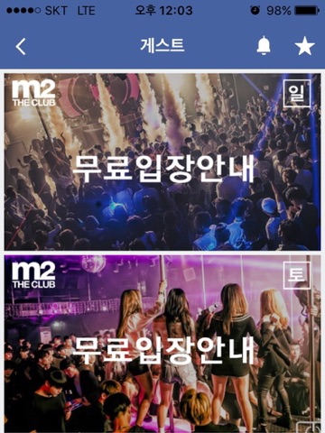 클럽 M2에 어플리케이션을 통한 무료 게스트 입장이벤트 등 클러버들에게 가장 필요한 것을 알고 있는 클럽매니아와의 노하우를 그대로 담아낸 클럽 엠투의 공식 어플리케이션! M2는 클럽매니아가 함께 만들어 갑니다.