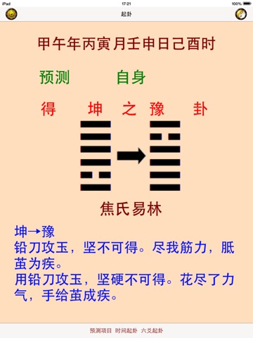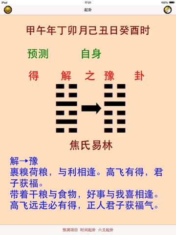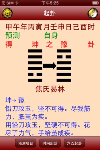 本功能包含了六爻起卦法和按时间起卦法,六爻起卦(纳甲法)是求测者按天人合一思想,摇钱起卦的方法;按时间起卦法,是按求测者问事的即时时间起卦的方法。显示内容为主卦、变卦、互卦的全部卦象及文字信息。焦氏易林内容,64×64 =4096种变化的焦氏易林,及其白话说明。