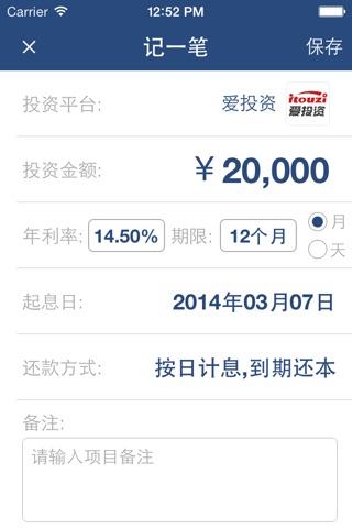 网贷账本目前支持人人贷、银客网、有利网等多家知名网贷平台、同时还提供自定义、添加新平台的功能,方便您管理所有的网贷投资,同时账本还为用户提供等额本息、按月付息、按天付息等多种还款方式。