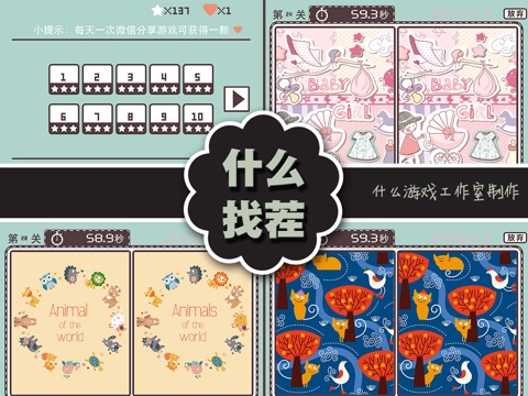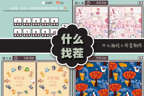 小清新版找茬游戏,可爱有趣的图片给您带来轻松愉快的时光。 不要小瞧这个游戏哦,你不一定可以在5秒内完成哦!