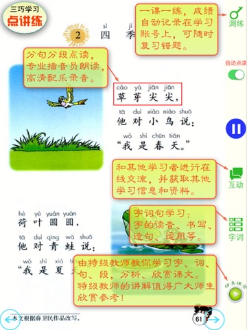 1. 点读:课文全文点读。朗诵者为国家级播音员,语言纯正;朗诵有配乐,怡情养性,陶冶情操。课本上所有的文字均可点读发声:拼音字母、生字、词语、句子、课文、儿歌、课后字词句。