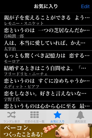 リマインダー機能、SNSへの投稿機能、お気に入り登録機能等がついた恋愛に関する名言アプリです。