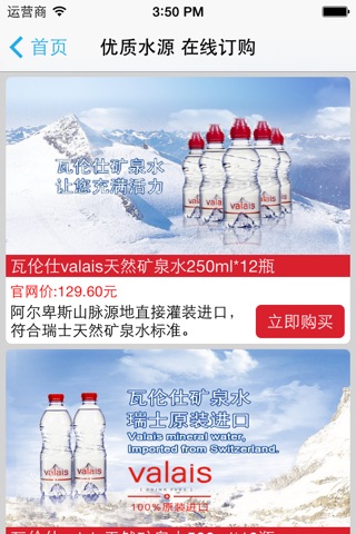 瓦伦仕中国唯一官方客户端,消费者通过下载此款客户端,完成会员注册/登录、商品浏览、在线购买、在线支付、订单查询、物流查询等一系列在线购物的流程。解决了用户在没有电脑的情况下也可以购买瓦伦仕矿泉水的问题。
