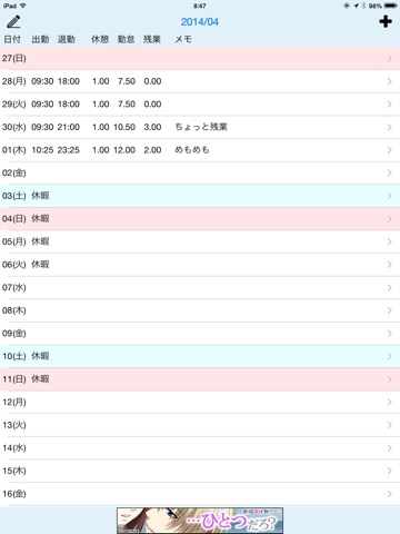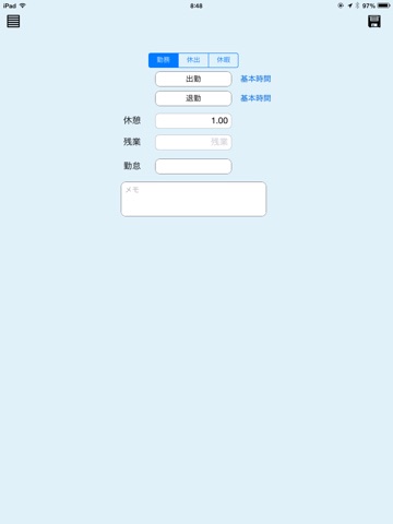 ・基本出退勤の時間と休憩時間を設定すると勤怠時間、残業時間を記録できます。