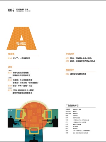 《中欧商业评论》是一本由中欧国际工商学院主办的高端管理杂志,以国际化的视野关注中国的商业生态和企业群落,秉承中欧“全球视野,聚焦中国”的理念,致力于成为高级管理人士的“决策必读物”,提升中国企业家的决策能力。2008年创刊以来,《中欧商业评论》已在企业界和学界赢得广泛影响力。 《中欧商业评论》是一座“移动”的商学院,学院所独有的优势教授资源(如吴敬琏、许小年、丁远等)和研究资源(如中欧陆家嘴国际金融研究院、案例研究中心、民营企业研究中心等),都将持续地通过杂志为读者输送权威的观点与研究成果。