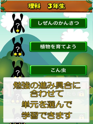 小学校3年生の理科アプリの決定版!学習の進み具合に合わせて単元を選択して、効率的に復習できます。4択のクイズ形式という使いやすさ、勉強のご褒美にモンスターを集めていく楽しさで、子供が継続的に勉強します。(iPad、iPhoneの両方に対応)