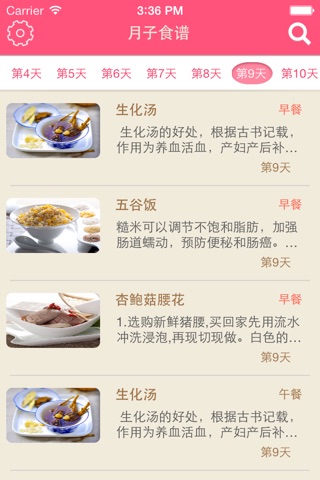 1.为宝妈精心准备海量产后恢复食谱,包含28天每日早,午,晚推荐以及炒菜,汤类,粥类等百道经典产后食谱。