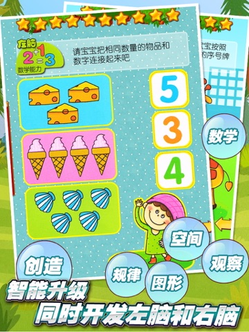 宝宝的无限可能来源于婴幼儿时期科学的开发,本软件从最实际,最朴实的智能开发理念出发,运用活泼,轻松的游戏形式,对孩子的左脑,右脑均衡开发,包含空间知识,找规律,图形,观察,创造各方面的锻炼。让宝宝大脑得到完整深度开发。