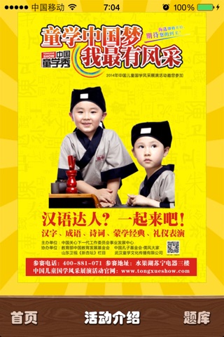简介:是一款儿童国学攻题益智游戏, APP和配套书籍,均为为“中国少儿国学大赛”特别定制。该大赛由中国关心下一代工作委员会事业发展中心主办、中国孔子基金会传统教育分会协办,为不收取报名费的公益活动。全国特设60个城市分赛区,同时为全国的少年儿童设置网络赛区。参赛年龄为幼儿组和小学组(1-3年级)。比赛内容:古诗、成语、礼仪、国艺、走秀。比赛将决出各分赛区和全国总决赛的金银铜奖和特金奖,以及最佳人气奖等。