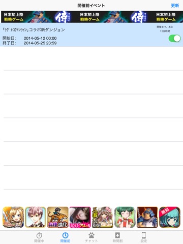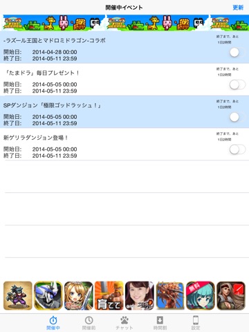 現在開催中・開催前のイベントやコラボの実施期間を一覧で表示し、ボタンを押しておくと開催開始日・終了日をアラームで教えてくれます。