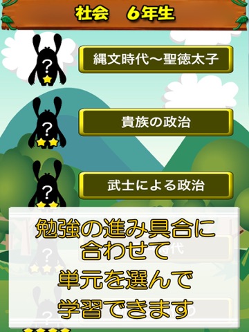 小学校6年生の社会アプリの決定版!学習の進み具合に合わせて単元を選択して、効率的に復習できます。4択のクイズ形式という使いやすさ、勉強のご褒美にモンスターを集めていく楽しさで、子供が継続的に勉強します。(iPad、iPhoneの両方に対応)