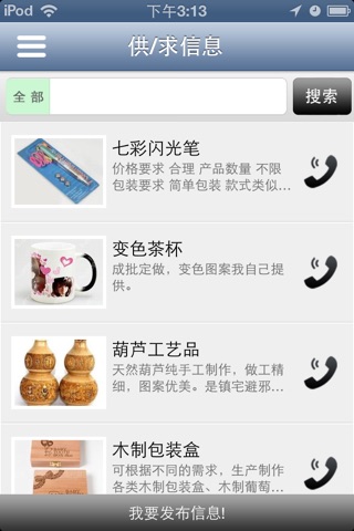 【会员中心】:注册会员可以通过手机端发布供/求信息,或查看其他用户的供/求信息,含一键拨号功能。