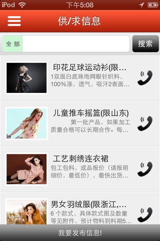 【供/求信息】:本应用利用列表的形式清晰的展示出各种服装辅料产品的最新详细讯息。