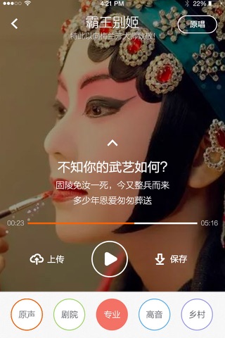 用户在“唱戏吧”可以选择各剧种唱段进行演唱、录音、上传、并分享到社交平台。演唱过程中,亦能学习名家原唱,陶冶情操、提升艺术。