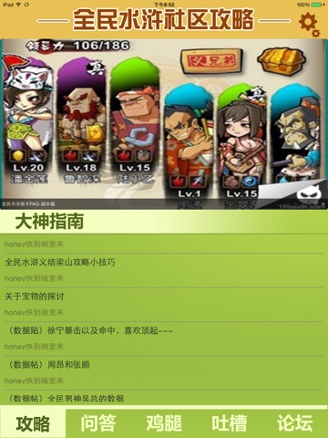 《全民水浒助手》本应用集合了大神攻略,官方最新活动,精彩的游戏视频,以及最强大的社区交流,能够让你在游戏中呼风唤雨,无论是毒杀阵还是暴杀阵亦或者是加血追击阵等等,你都能在这里找到!路见不平一声吼,抱着土豪不放手~!还在看着土豪的阵容发呆吗?还在为抽不到紫将发愁吗?还是在为拜龙头上不去而心烦意乱呢?有国内手游媒体推出的《全民水浒助手》可以帮你解决一切难题,玩《全民水浒》就下载游戏助手,哥哥还在等什么,梁山聚义今天你不去了吗?Let‘s go~!