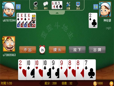 歪歪斗地主是一款带有浓郁民族风的扑克游戏,拥有广泛的群众基础,包括叫地主、明牌等众多特色玩法。游戏中有地主一名,农包两名;地主需要费劲心机,压迫农民;而农民则要相互配合,斗倒地主;无论地主或者农民,首先出完手牌的玩家所在一方获得牌局的胜利。