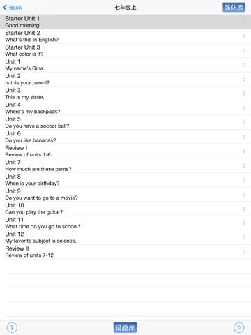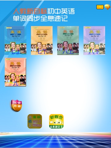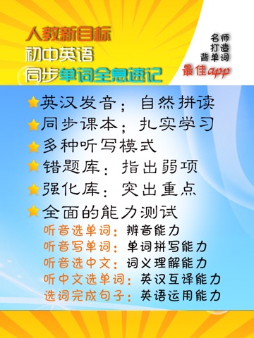 本软件配套人教社初中《新目标英语》, 按单元进行同步词汇背诵。《新目标英语》教材有两个版本,请通过查看软件中所显示的”单元名称“来核对你需要的版本。