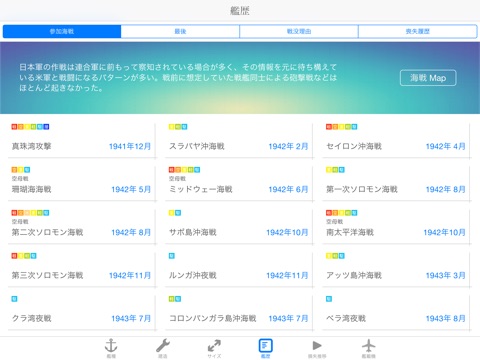 連合艦隊主要艦艇データベースは太平洋戦争を戦った旧日本海軍の主要な艦艇、382隻のデータを集めた図鑑アプリです。ユーザーの関心に応じて様々な切り口で、書籍では不可能だったデータの抽出や並べ替えを行うことが出来ます。また沈没地点が判明している艦艇(382隻中307隻)を抽出データ毎にグーグルマップにまとめて表示することが可能です。