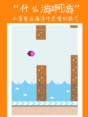 玩家通过点击屏幕,控制章鱼在海洋中前行。每穿过一组木箱获得一分。 玩家必须控制好章鱼飞行的节奏,一旦落地或碰到水中的木箱,则游戏结束。