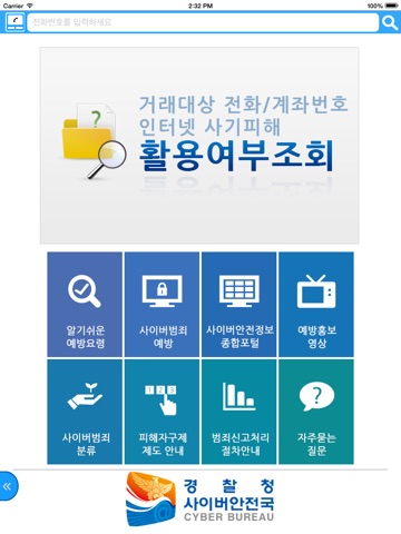 - 인터넷으로 물품을 거래 할 때, 판매자의 계좌번호나 전화번호가 인터넷 사기에 이용된 번호인지 검색 기능 제공(모바일웹)