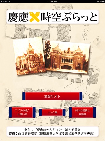 「慶應時空ぷらっと」は、現在の景色のなかに見えない過去を観るためのアプリです。慶應義塾大学三田キャンパスが開設された明治4年(1871)以来、150年以上の歴史のなかで描かれてきた地図の中から選り抜かれた12枚の地図と300枚以上の古写真を、このアプリをとおして閲覧できます。