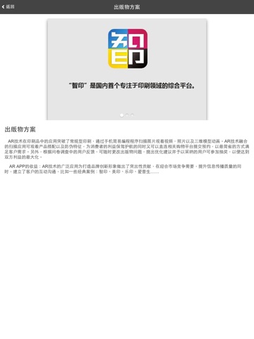 使用“智印”的移动客户端,用户可以了解印刷行业最新资讯、掌握技术动态、搜寻身边优质服务商,并且通过增强现实TMAR镜头,可以将平面媒体转化为功能型的网络多媒体,从而实现互联网+印刷的增值商务应用并成为O2O解决方案的有力工具。同时,配合“智印“网络平台,将个性化印品定制、商务网络印刷有机的结合在一起。