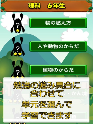 小学校6年生の理科アプリの決定版!学習の進み具合に合わせて単元を選択して、効率的に復習できます。4択のクイズ形式という使いやすさ、勉強のご褒美にモンスターを集めていく楽しさで、子供が継続的に勉強します。(iPad、iPhoneの両方に対応)