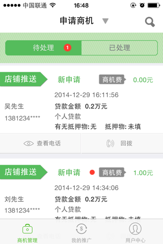 3. 消息推送:新来电/新申请第一时间告知,及时处理商机
