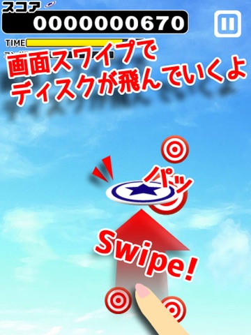 制限時間内に画面をスワイプしてディスクを飛ばし、的に当てていくゲームです。